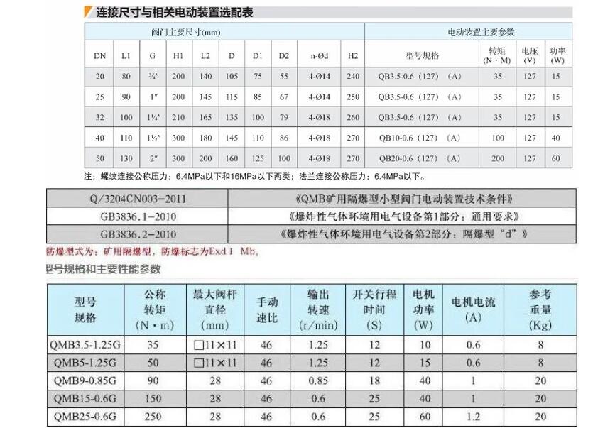 上海湖泉閥門集團有限公司礦用小口徑電動球閥是一種由球體旋轉而開閉水路的新型礦用隔爆型電動球閥(以下簡稱電動球閥),由于其適應的供水壓力范圍廣、不受泥沙、污水影響、供水通徑大、工作過程中通電時間短、工作穩(wěn)定可靠、是一種代用電磁閥的理想替代產品。 防爆型式:隔爆型;防爆標志:ExdⅠ,是一種由球體旋轉而開閉水路的新型礦用隔爆型電動球閥(以下簡稱電動球閥),由于其適應的供水壓力范圍廣、不受泥沙、污水影響、供水通徑大、工作過程中通電時間短、工作穩(wěn)定可靠、是一種代用電磁閥的理想替代產品。 防爆型式:隔爆型;防爆標志:ExdⅠ。 執(zhí)行標準:Q/ZLH07-2008、MT/715-1997標準。 正常工作條件: 電動閥應在下列條件下可靠的工作: 海拔高度不超過2000m; 環(huán)境大氣壓80-110kPa; 環(huán)境溫度-20-+40℃; 周圍空氣相對濕度不大于95%(25℃時); 具有甲烷混合物及煤塵爆炸危險的煤礦井下; 在無顯著振動的地方; 在無破壞金屬絕緣的氣體和蒸氣的環(huán)境; 在無滴水的地方。是一種由球體旋轉而開閉水路的新型電動閥門,它由數字邏輯控制電路,方向控制電路,電流采樣控制電路,工作狀態(tài)指示電路等組成;接入24VDC電源后,控制端K1、K2有繼電器無源點控制球閥的開啟與關閉,K1與K2短接球閥打開,K1與K2斷開球閥關閉。由電流采樣控制電路檢測球閥的工作位置, 工作狀態(tài)指示電路指示球閥的工作狀態(tài): 球閥旋轉開啟,綠色LED亮;當開啟到設定口徑時,黃燈亮(此時電機不耗電);當球閥旋轉關閉時,紅燈亮(此時電機不耗電)。 四.主要技術參數 1. 防爆標志: ExdⅠ 2. 輸入電壓: 24V DC. 3. 工作電流: ≤70mA DC. 4. 環(huán)境溫度: 0℃~40℃ 5. 環(huán)境濕度: ≤95%RH.(25℃時) 6. 大氣壓力: 80~110kPa 7. 水壓適應范圍 : 0.2MPa~7.0MPa。 8. 水溫適應范圍 : 0~60℃ 9. 球閥開啟速度 : 6s~12s 10。